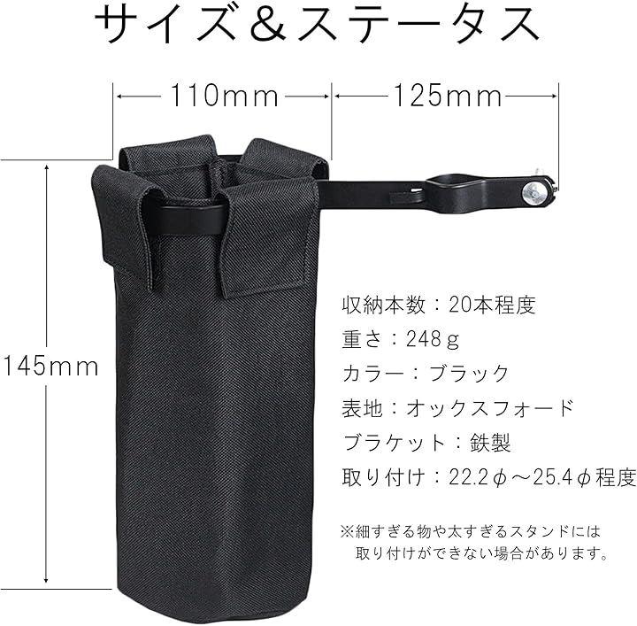 ▶収納本数:20本程度 ▶重さ:248g ▶カラー:ブラック ▶表地:オックスフォード ▶ブラケット:鉄製 ▶サイズ:ホルダーの直径は約110mm、高さは約145mm