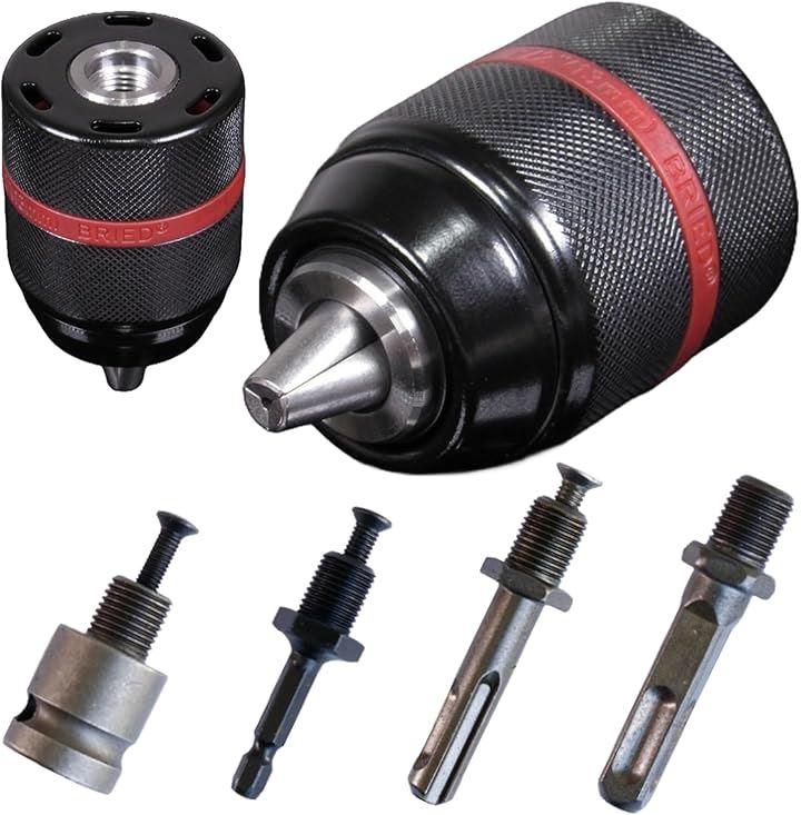 「セット内容」13mmキーレスチャックx1、アダプターx4(6.35mm六角軸/SDSプラス軸/1/2インチレンチ対応軸/四角軸)「素材」クロムバナジウム鋼「対応径」2~13mm「機能」ラチェット機構/キーレス式/三爪チャック/多軸対応「特徴」高い引張強度・硬度/耐久性/耐摩耗性/耐衝撃性/耐腐食性