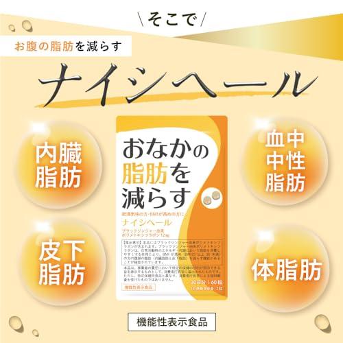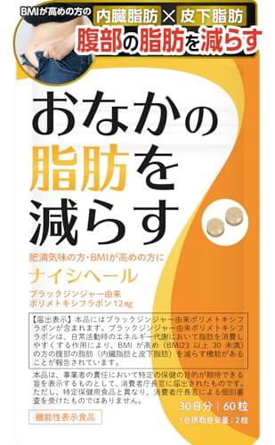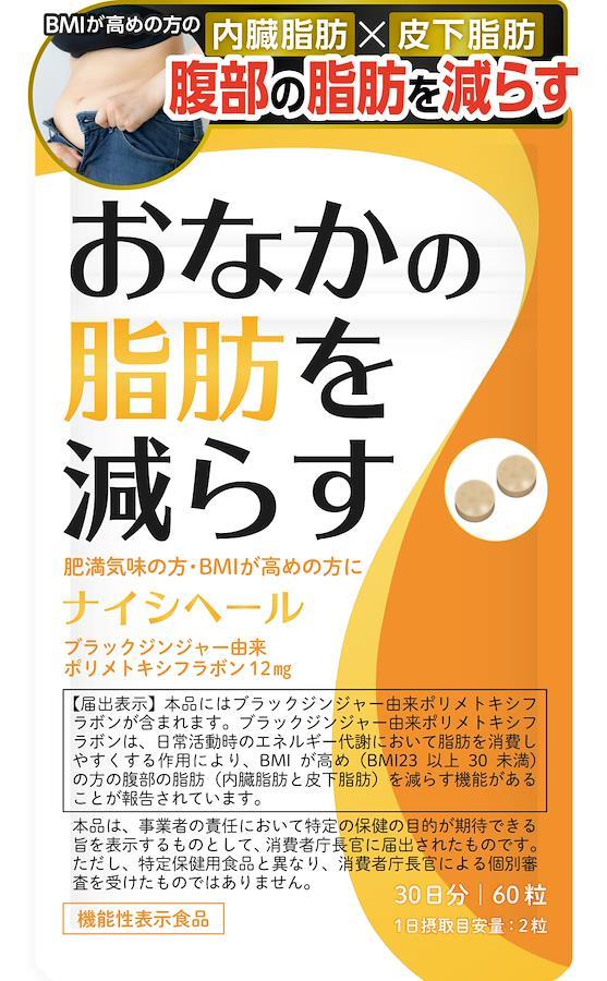 ?ナイシヘールはお腹の脂肪を落とし皮下脂肪、内臓脂肪を減らすサプリメントです。 ?【届出表示】本品にはブラックジンジャー由来ポリメトキ シフラボンが含まれます。ブラックジンジャー 由来ポリメトキシフラボンは腹部の脂肪(内臓脂肪)および 血中の中性脂肪を減らすのを助ける機能がある ことが報告されています。届出番号:G722 ?本品は事業者の責任において、特定の保険の目的の期待が出来る旨を表示できるものとして、消費者庁長官に届出た機能性表示食品です。トクホではありません。 ?その他にも、ガルシニア、乳酸菌、ビフィズス菌、DHA、サラシアなどダイエットをサポートする副成分を配合。 ?製造工場も国内で医薬品レベルの取り扱いをする工場で開発・製造。品質管理にも徹底的にこだわっています。