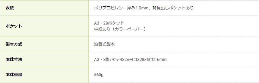 本体寸法:A3/S型/タテ432×ヨコ328×背巾16mm本体重量:560g表紙:ポリプロピレン、厚み1.0mm、背見出しポケットありポケット:A3・20ポケット/中紙あり(カラーペーパー)製本方式:溶着式製本【免責事項】メーカーによる商品リニューアルに伴いパッケージが変更が行われた場合、新パッケージでお届け致します事ご了承願います。