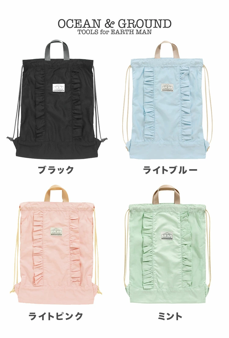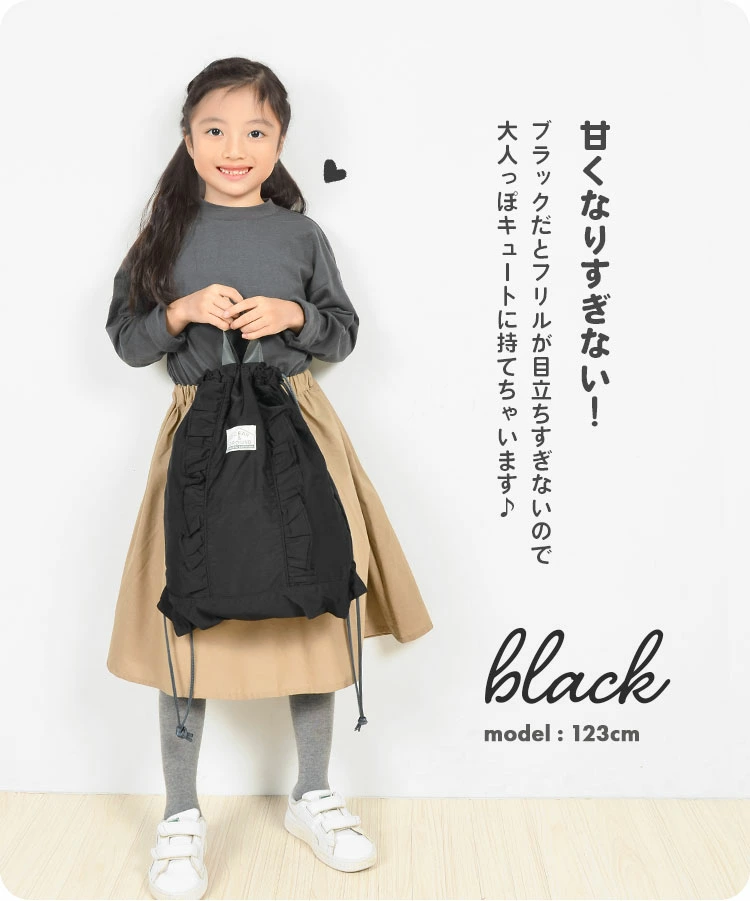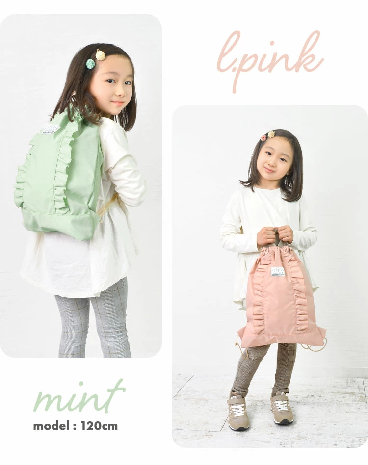 【ナップサック Frill】入園入学準備にぴったりのサイズ感!さらりとした上品な生地と色合いがおしゃれなフリルナップサック。体操服入れとしてはもちろん、遠足や社会科見学などの学校行事シーンにもお使いいただけますよ♪