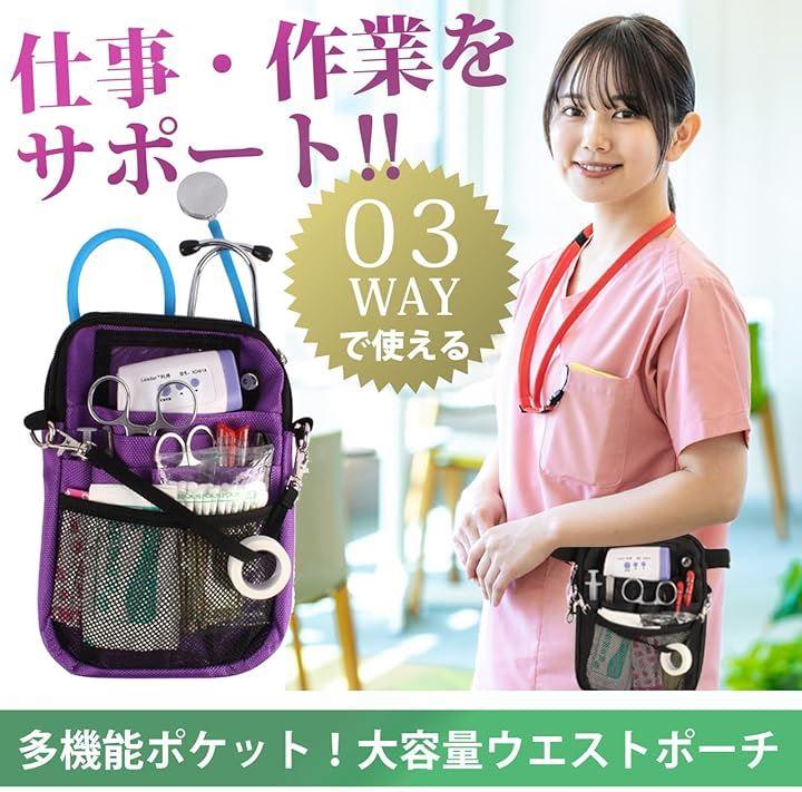 「多機能ポケットを兼ね備えた仕事用ウエストポーチ」メモ帳、iPad mini、ドリンクボトルなどが入る大きめのポケット、貴重品や鍵が入れられる内部ファスナー付きポケット、ペンやドライバーなどの入る細長いポケット、小物収納にぴったりのメッシュポケットなど、大小のポケットの組み合わせで使いやすさ抜群。感染対策でよく使う「手指消毒液ボトル250ml」も入るので、ナースオーガナイザーとしても便利です。