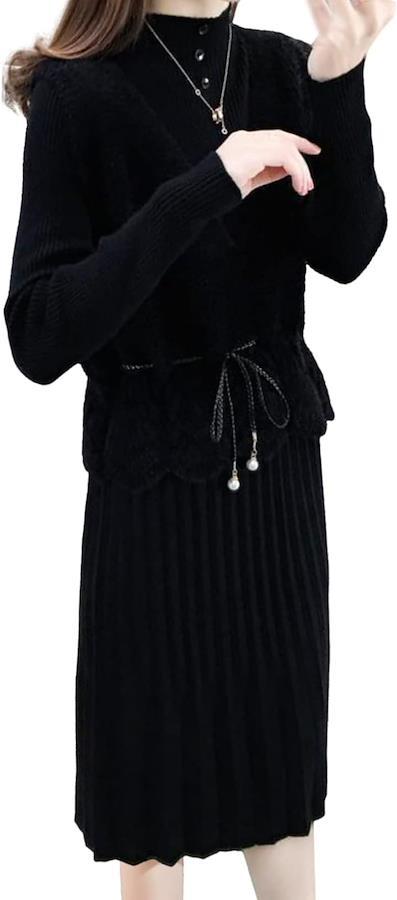 かわいいスタイルのセットアップ。ニットワンピースとフリースベストのツーピースアイテムです。