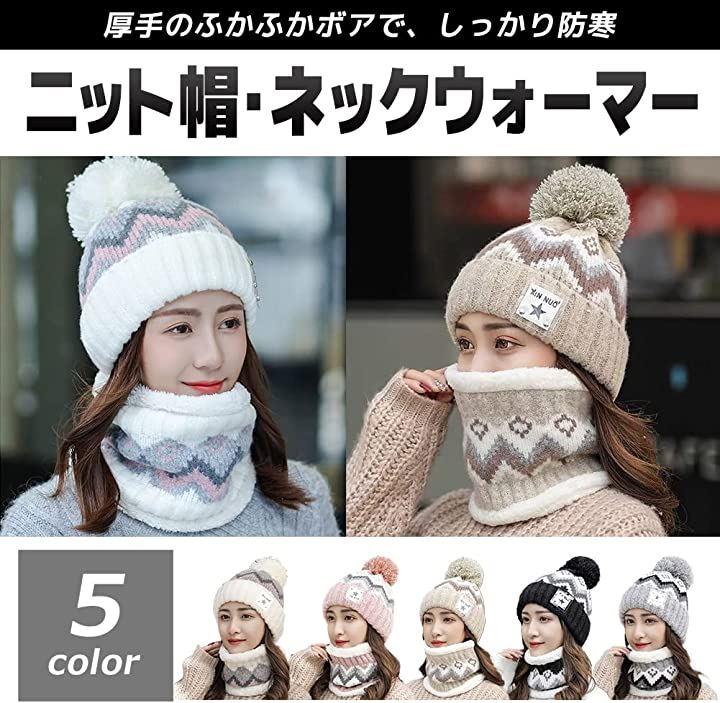 「カラー」ホワイト、ピンク、ベージュ、ブラック、グレー「材質」アクリル「セット内容」帽子、ネックウォーマー「サイズ」「サイズ」フリーサイズ、ニット帽子:高さ約23cm(平置き採寸)、頭周り約52~60cm、ネックウォーマー:高さ約17.5cm、幅約24cm(平置き採寸)