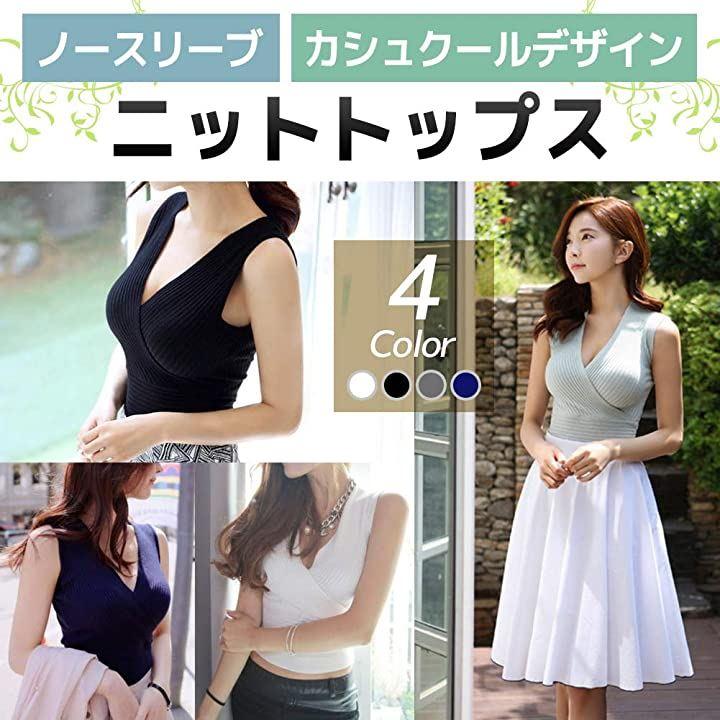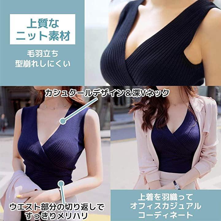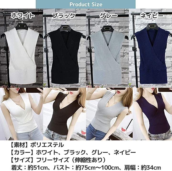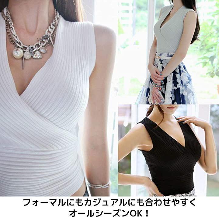 [FUPUTWO]ニットセーターレディースVネックトップス胸元セクシーノースリーブリブカシュクールカットソー