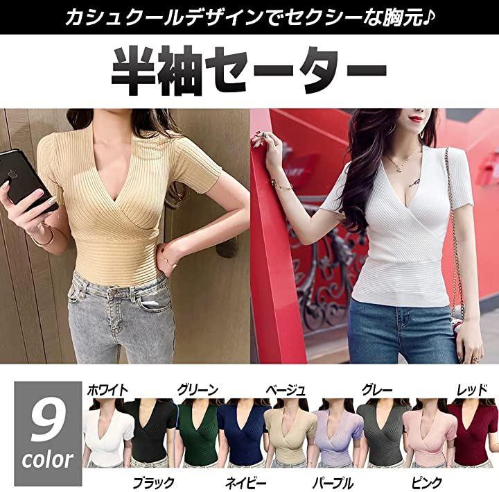 リブ素材でフィット感があり様々なコーディネートに合わせやすいカシュクールの半袖セーターです。