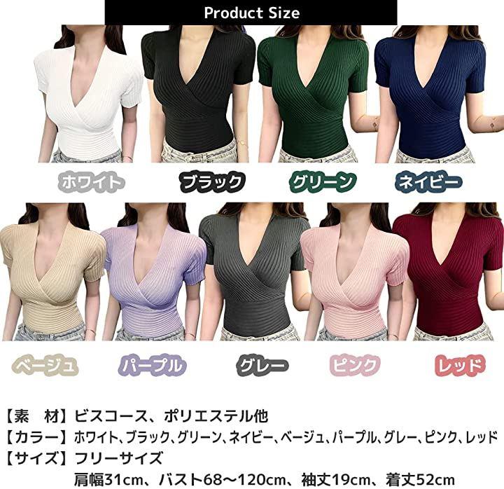 ・「カラー」ホワイト、ブラック、グリーン、ネイビー、ベージュ、パープル、グレー、ピンク、レッド「素材」ビスコース、ポリエステル他「サイズ」フリーサイズ、肩幅31cm、バスト68~120cm、袖丈19cm、着丈52cm