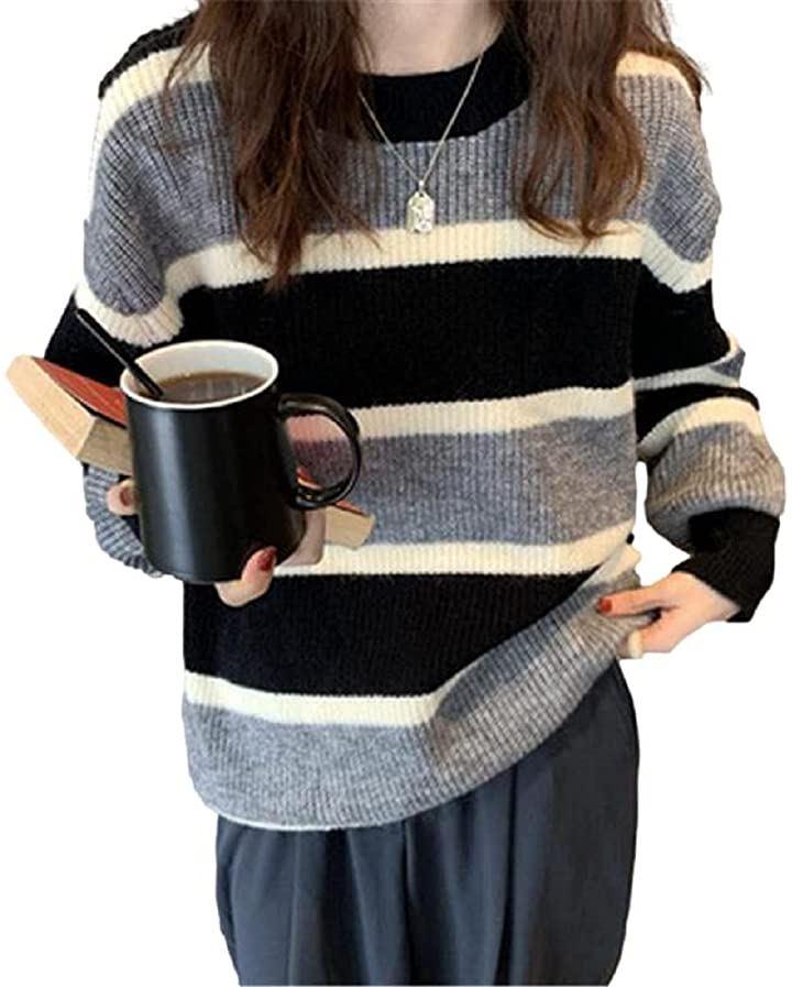 [1/2plus(ニブンノイチプラス)]ざっくりカジュアルアウタークルーネックボーダーニットセーターレディースリラックス感のあるシルエットながら、オーバーサイズ過ぎずバランスがとりやすい着丈がポイント。