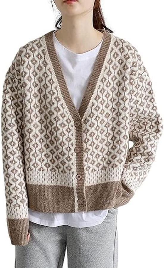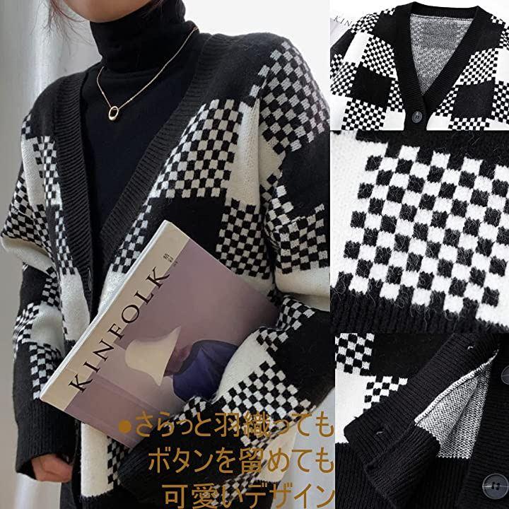 1枚でコーデ映え、チェックとジャガード柄のジャガードニットカーデ。