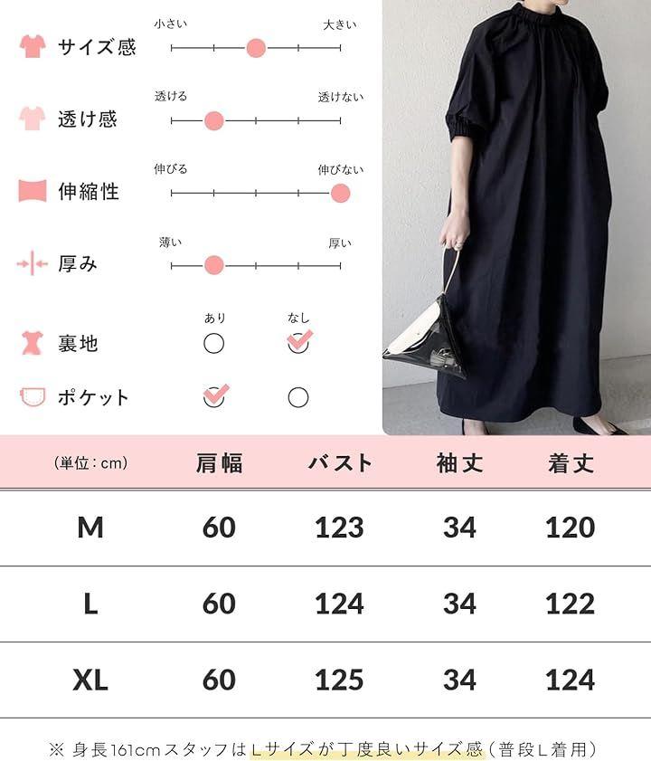 サイズ:肩幅/バスト/袖丈/着丈 (M)60/123/34/120 (L)60/124/34/122 (XL)60/125/34/124