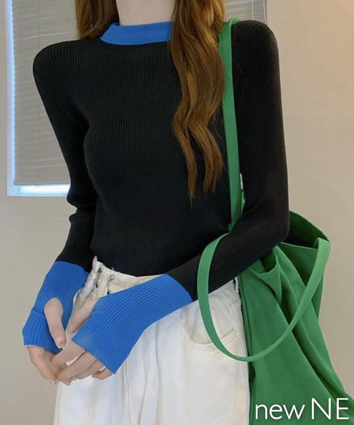 「目を惹くバイカラートップス」発色の良い切り替えデザインがぱっと目を惹く、バイカラーデザインのニットトップスの登場です。