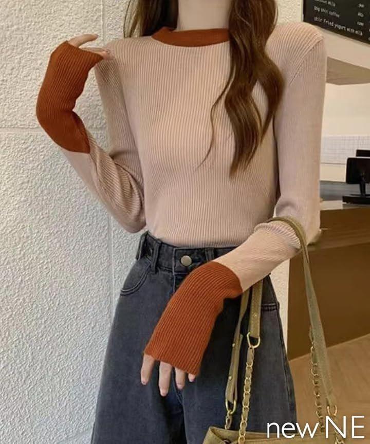 「目を惹くバイカラートップス」発色の良い切り替えデザインがぱっと目を惹く、バイカラーデザインのニットトップスの登場です。