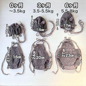 サイズは0ヶ月(2.5-3.5kg)、3ヶ月(3.5-5.5kg)、6ヶ月(5.5-8kg)の3種類をご用意。
