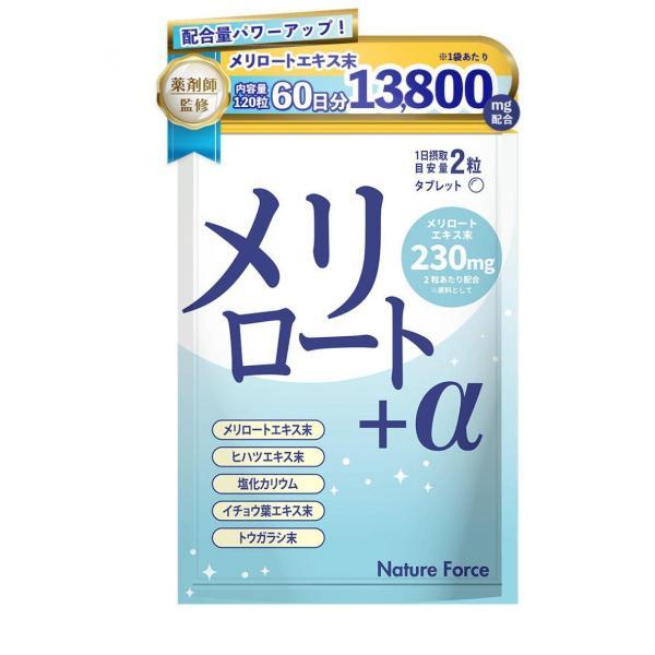 製品の特徴●ネイチャーフォース メリロート+α(プラスアルファ)60日分 120粒入●サプリメント●【リニューアル】メリロート配合量が1袋12,000mg→13,800mg(*)にパワーアップしました!●【業界最高水準の配合量】1日2粒あたりにメリロートエキス末をたっぷり230mg(*)配合しました。●【飲みやすい小さめの粒】直径8mmの小さめ粒を採用。1日2粒でも飲みやすいサイズ感にしました。●【サポート成分も充実】ヒハツ、カリウム、イチョウ葉、トウガラシなど、メリロートと一緒に摂りたいめぐりサポート成分も配合。●【安心のための取り組み】メリロート+αは薬剤師が監修した健康食品です。日本国内のGMP認定工場で製造しています。●着色料フリー、香料フリー、酸化防止剤フリー。●Nature Force(ネイチャーフォース)は通販できるみんなのお薬のプライベートブランドです。●原産国:日本製●内容量:26.4g(120粒入り)