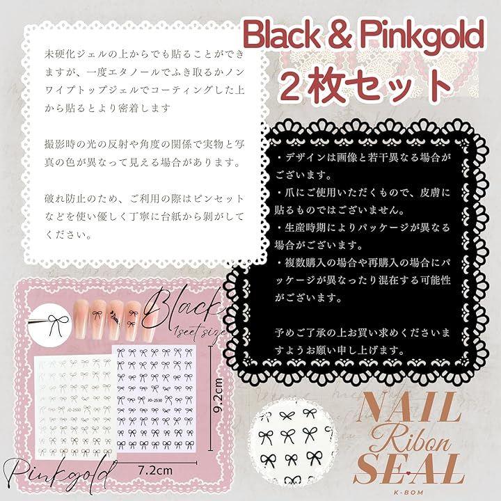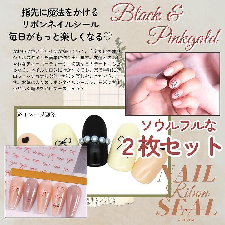 ブラックとピンクゴールドの2枚セット、ネイルアートに最適なソウルフルなリボンのネイルシールです。