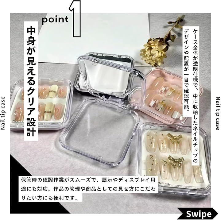 「中身が見えるクリア設計」 ケース全体が透明仕様で、中に収納したネイルチップのデザインや配置が一目で確認可能。