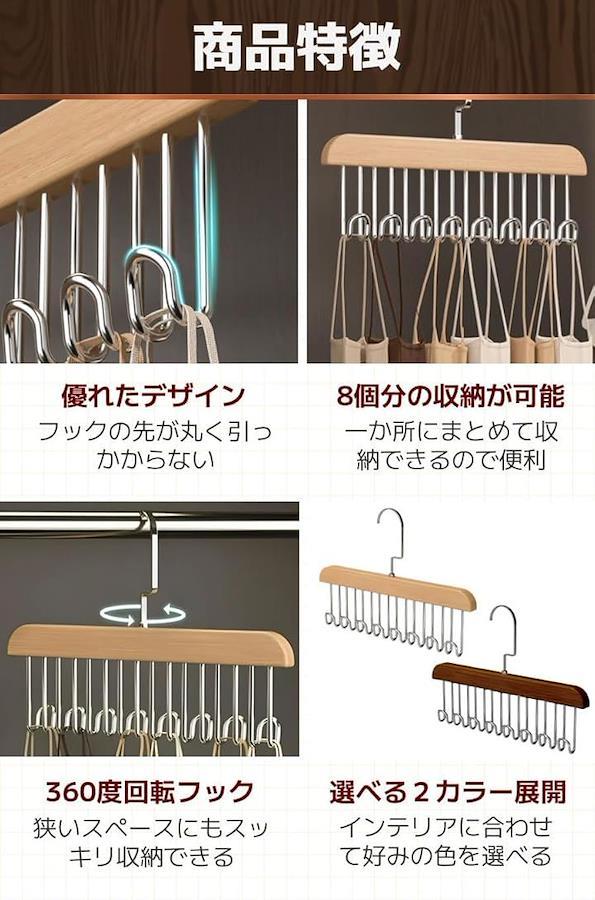 「商品特徴」(1)優れたデザイン:フックの先が丸く引っかからない/(2)8個分の収納が可能:一か所にまとめて収納できるので便利/(3)360度回転フック:狭いスペースにもスッキリ収納できる/(4)選べる2カラー展開:インテリアに合わせて好みの色を選べる