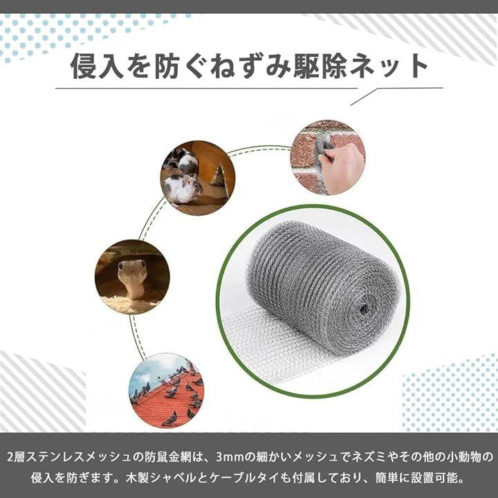 「侵入を防ぐねずみ駆除ネット」2層ステンレスメッシュの防鼠金網は、3mmの細かいメッシュでネズミやその他の小動物の侵入を防ぎます。