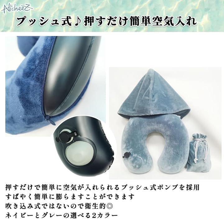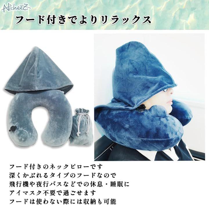 「商品内容」フード付きエアネックピロー 材質:ベロア生地/PVC カラー:グレー/ネイビー サイズ:縦/約29cm 横/約30cm 厚さ/約10.5cm 専用収納袋付