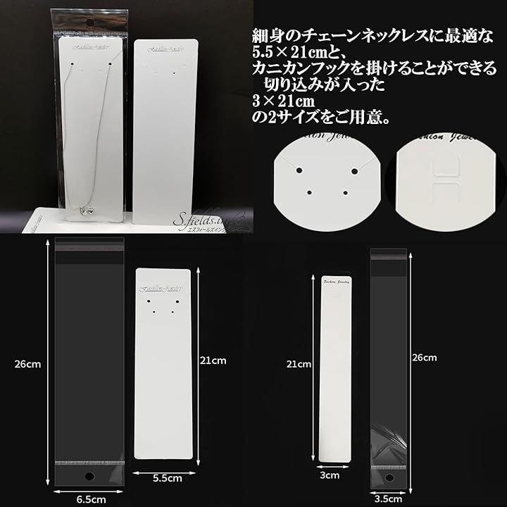 細身のチェーンネックレスに最適な5.5x21cmと、カニカンフックを掛けることができる切り込みが入っった3x21cmの2サイズをご用意。