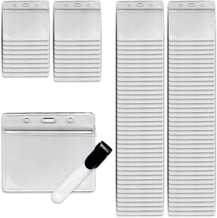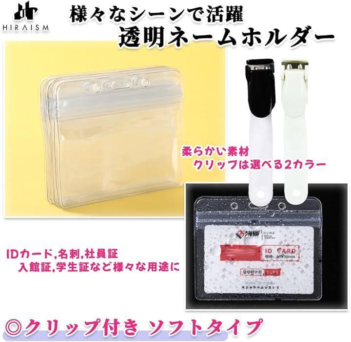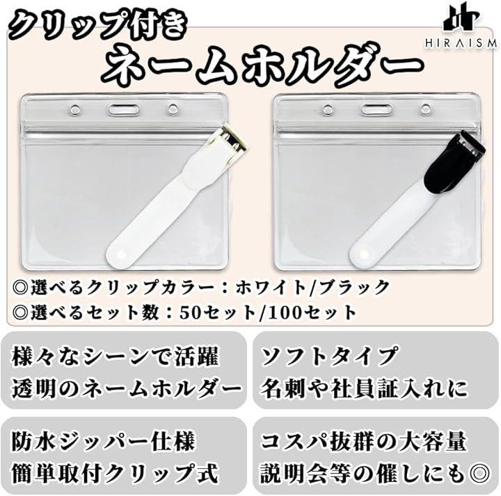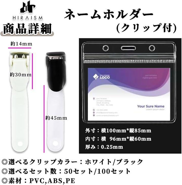 「商品内容」ネームホルダー(クリップ付き):50セット/100セット <カラー> 本体:透明 クリップ:ブラック/ホワイト <素材> 本体:PVC クリップ:ABS、PE <サイズ> 本体:外寸100x85mm 内寸96x60mm 厚み:0.25mm クリップ:14x30mm バンド長:45mm 適用サイズ例:国内標準名刺(普通4号):91x55mm キャッシュカード;85x49mm etc