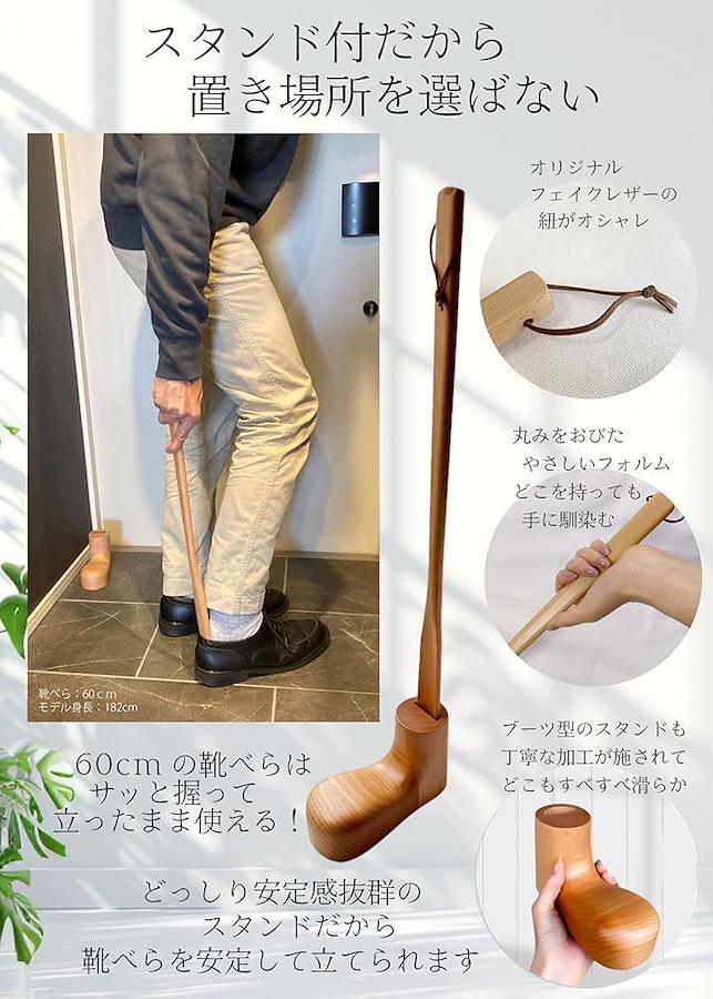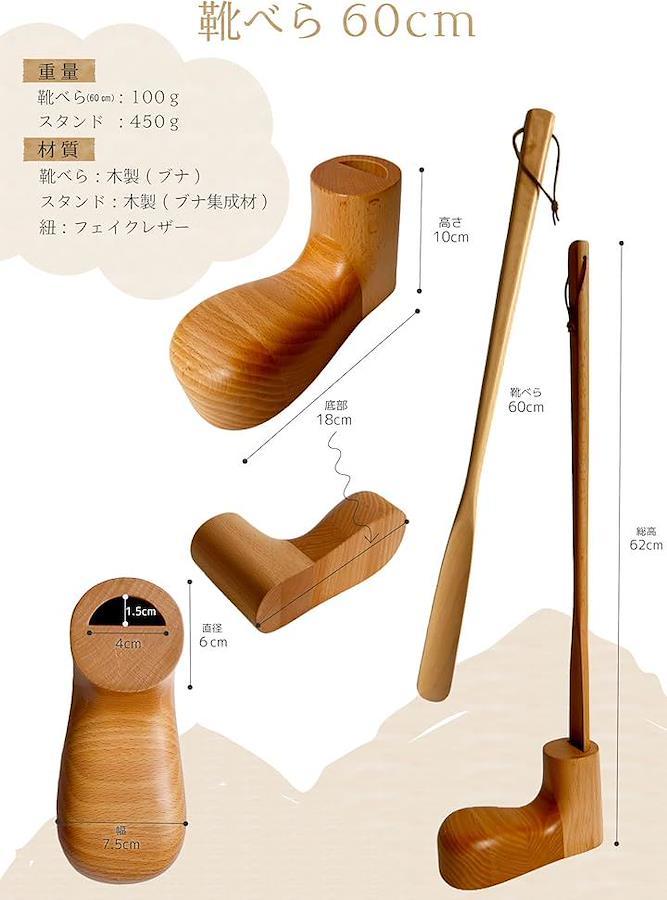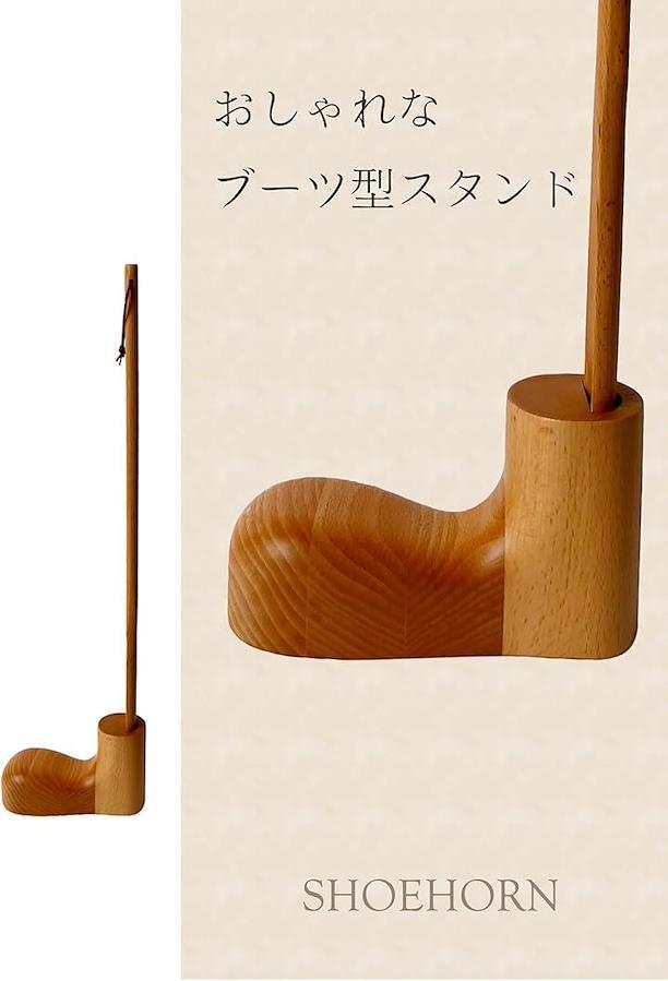ずっしり重く安定感抜群。 「サイズ」靴べら 60cm、ブーツ型スタンド 18x7.5x高さ10cm 「重量」靴べら 100g、ブーツ型スタンド 450g 「材質」木製 (ブナ) ウレタン塗装、紐 (合成皮革) 丁寧な加工ですべすべ滑らか、木製スタンド付き靴べら。