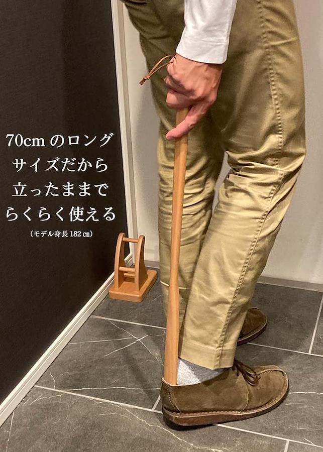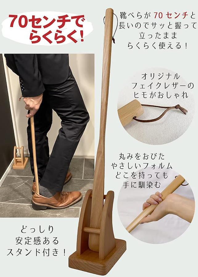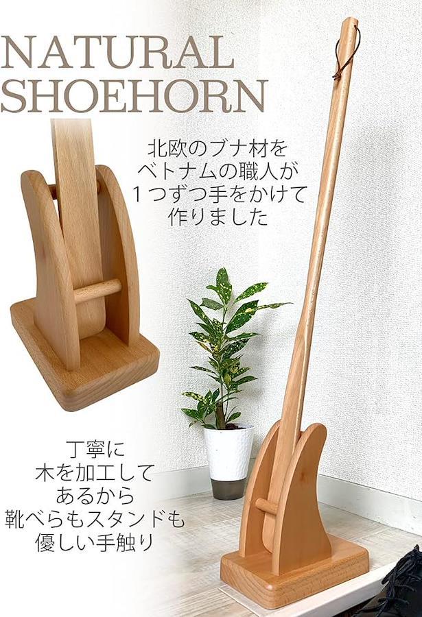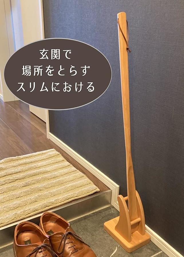フェイクレザーの紐はブナ材と調和して上質感がアップ。お気に入りの”くつべら”に変えると気持ちよくお出かけできますよ。玄関で場所を取らずスリムに置けるのが人気。飲食店や衣類店のフィッティングルームにも最適。ロングサイズなので立ったままでの使用がラクラク。