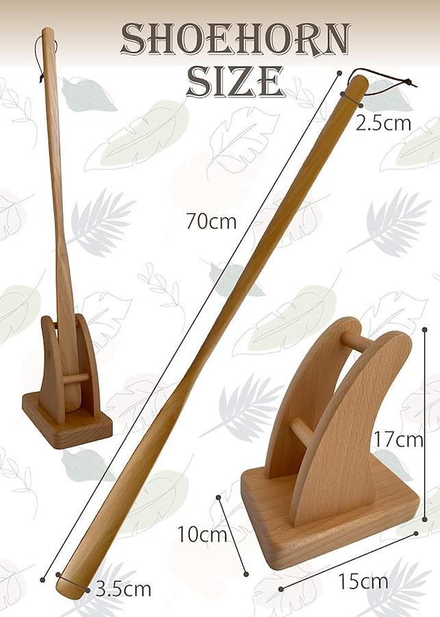 「サイズ」靴べら 70cm、スタンド 15x10x高さ17cm「重量」547g (靴べら:156g スタンド:391g)「材質」木製(ブナ) ウレタン塗装、紐 (合成皮革)