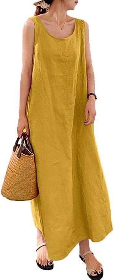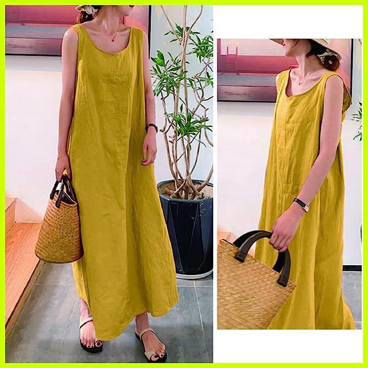 布帛素材のノースリーブ型ロングワンピース。