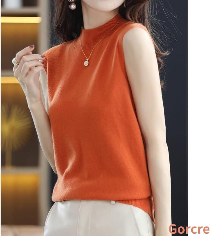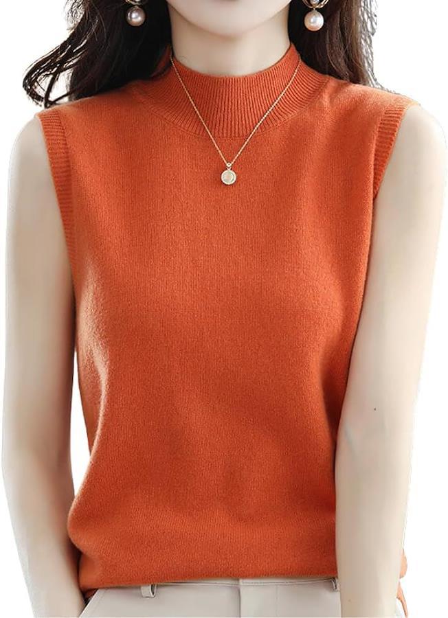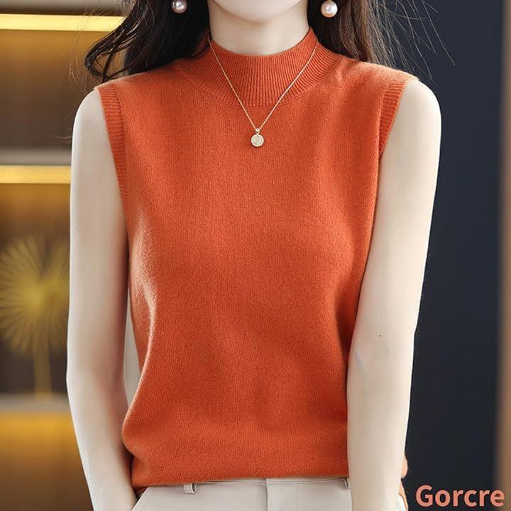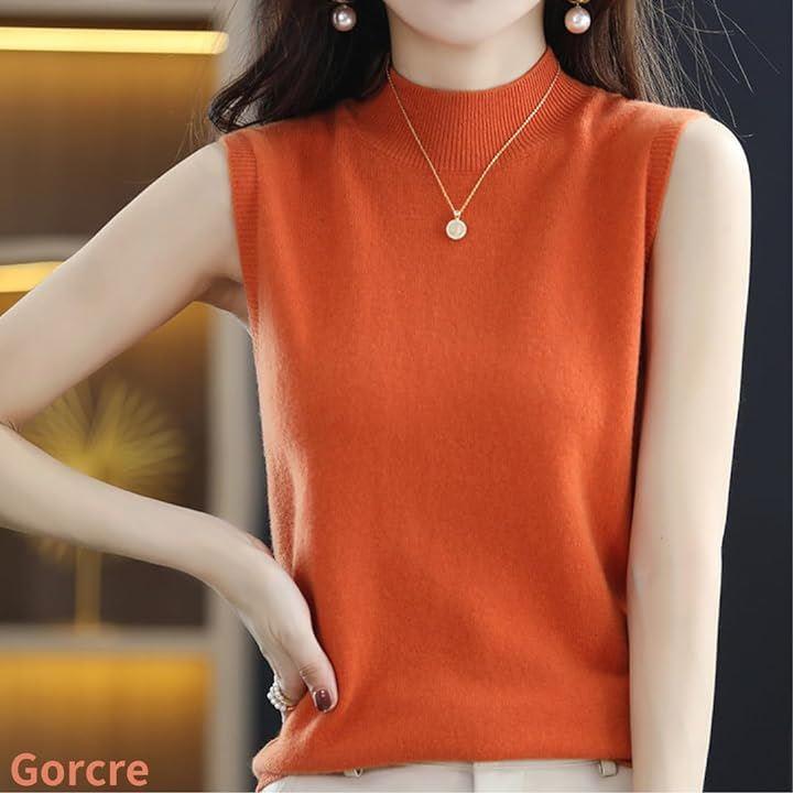 ハイネックノースリーブに、襟と袖がリブ仕様になって、フェミニンな大人の女性を演出。