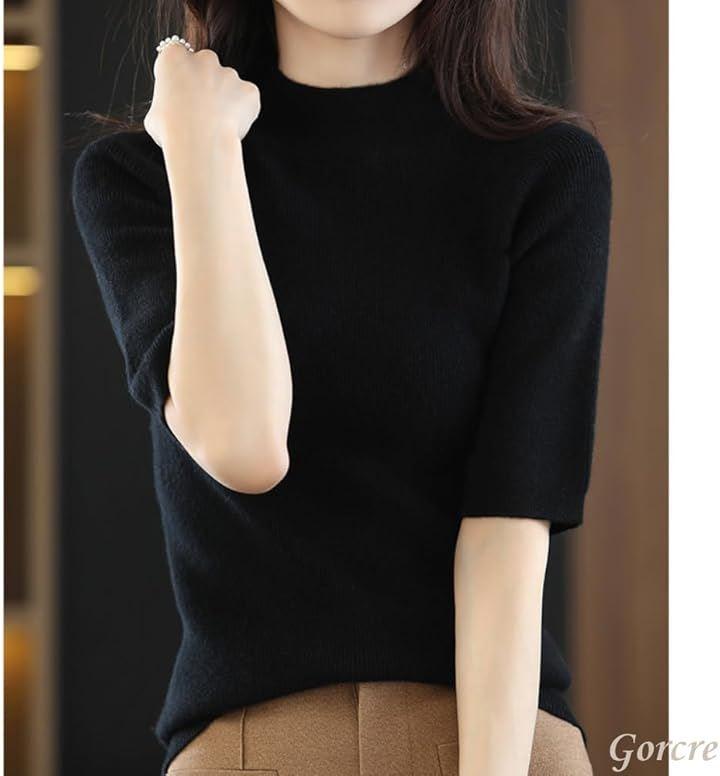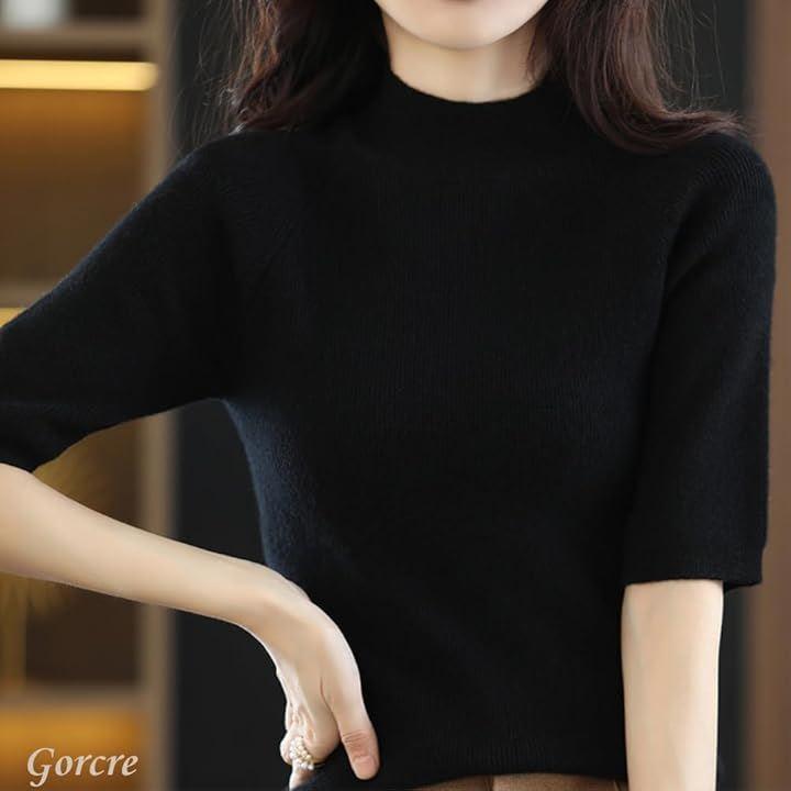 「ずっと続く美シルエット」かゆくない・伸縮・あったかで、春・秋・冬はずっと上品美シルエットでおまかせ。ハイネックでリブニット半袖トップスのお届けです。