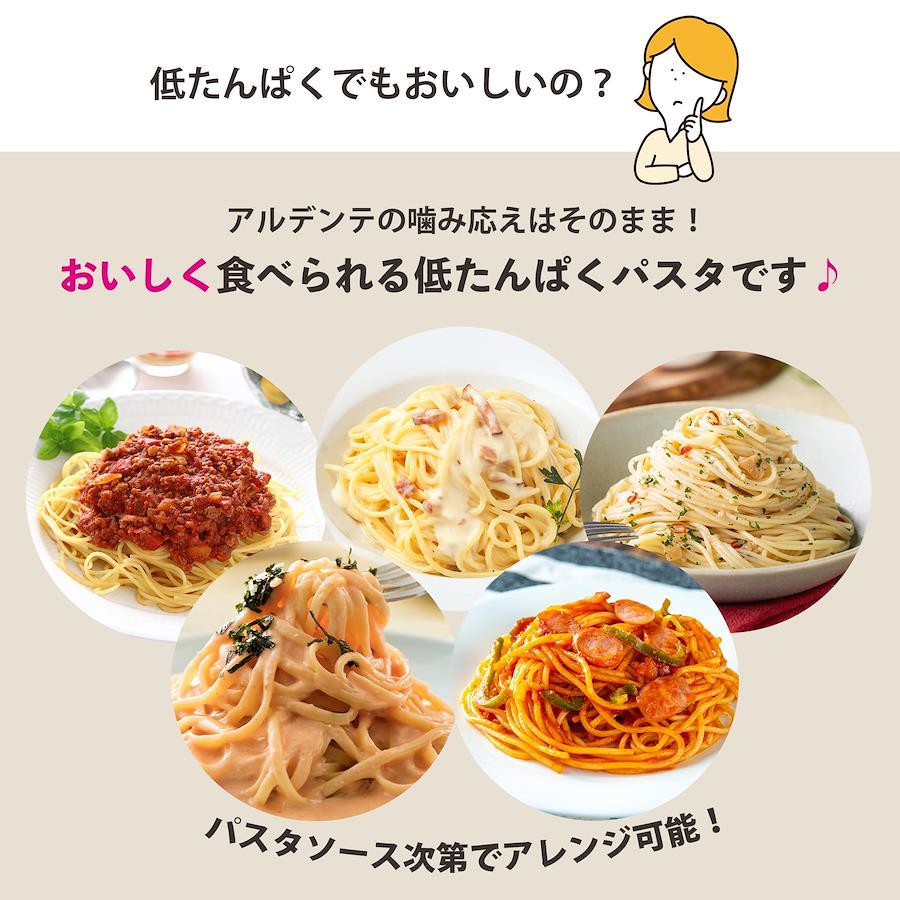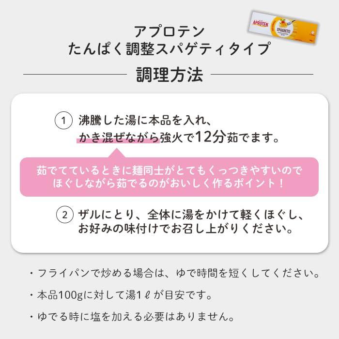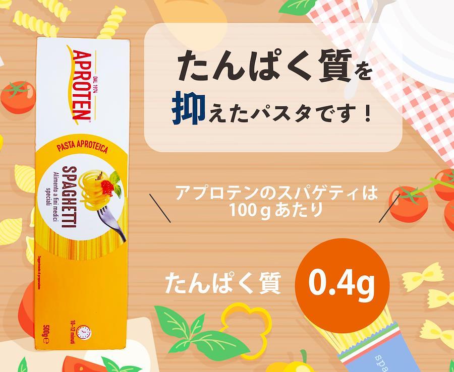 主食の量は減らさずに「たんぱく質」を調整し、しっかり食べて美味しく食事をコントロール! 太さ1.8mmのスパゲティタイプです。普段の食事やお弁当にも。 アプロテンシリーズは、でん粉が主原料に使われているため、たんぱく質は通常のマカロニ・スパゲティ類(デュラム小麦のセモリナを原料)の約1/20に抑えられています。(※五訂増補日本食品標準成分表のマカロニ・スパゲティ類(乾)のたんぱく質13.0g/100g当りと比較した場合)