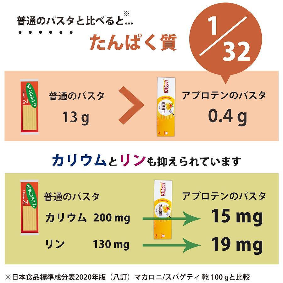アプロテンシリーズは、でん粉が主原料に使われているため、たんぱく質は通常のマカロニ・スパゲティ類(デュラム小麦のセモリナを原料)の約1/21に抑えられています。【重要】メーカーによる商品リニューアルに伴いパッケージ(内容量も含む)変更が行われた場合、新パッケージでお届け致します事ご了承願います。