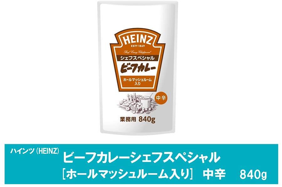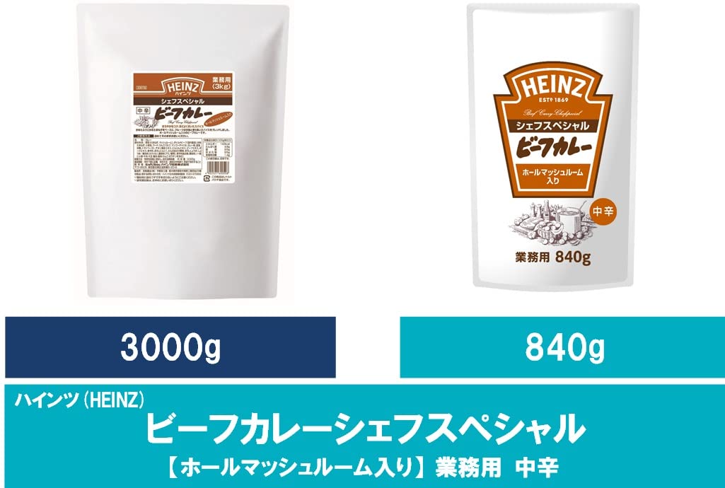 野菜(たまねぎ、マッシュルーム)、ボイルドビーフ(国内製造)、炒めたまねぎ、小麦粉、ラード、りんごパルプ、マンゴーチャツネ、カレー粉、食塩、砂糖、トマトペースト、チキン風味エキス、にんじんエキス、ビーフエキス、ポークエキス、香辛料、おろしにんにく、たん白加水分解物、おろししょうが、しょうゆ/着色料(カラメル)、調味料(アミノ酸等)、香辛料抽出物、酸味料、(一部に小麦・牛肉・大豆・鶏肉・豚肉・りんご・ゼラチンを含む) 100gあたり:エネルギー 132 kcal、たんぱく質 4.4 g、脂質 8.7 g、炭水化物 8.9 g、食塩相当量 1.3 g