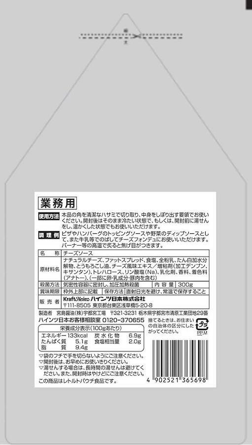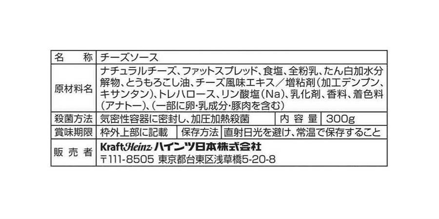 原材料:ナチュラルチーズ、ファットスプレッド、食塩、全粉乳、たん白加水分解物、とうもろこし油、チーズ風味調味料、増粘剤(加工デンプン、キサンタン)、トレハロース、リン酸塩(Na)、乳化剤、香料、アナトー色素、水