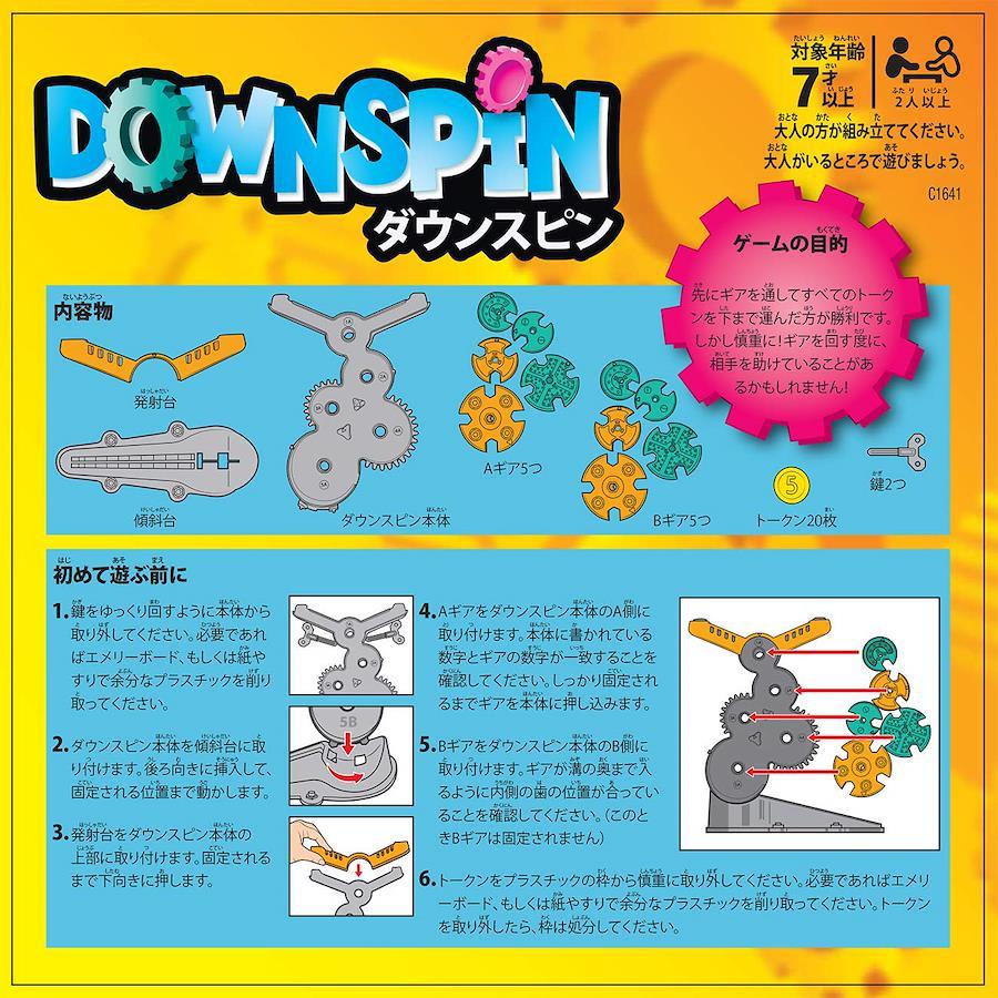 ギアを順にまわして、先に10枚すべてのトークン(コマ)を下まで運んだ方が勝ち、というゲームです。 ダウンスピンは、上位2%のIQ(知能指数)を持つ人たちが参加する国際グループ"mensa(メンサ)"の認定をもらった、お子さまの「戦略的計画」、「批判的思考」「視覚的推論」スキルを養うゲームです。 対象年齢:7才以上 内容物:発射台1つ、傾斜台1つ、ダウンスピン本体1つ、Aギア5つ、Bギア5つ、鍵2つ、トークン20枚[セット内容]発射台1つ、傾斜台1つ、ダウンスピン本体1つ、Aギア5つ、Bギア5つ、鍵2つ、トークン20枚(.co.jpより) 【高IQのグローバル集団 mensa認定ゲーム】ギアを順にまわして、先に10枚すべてのトークン(コマ)を下まで運んだ方が勝ち、というゲームです。 【相手の動きを先読みしつつ、自分のトークンを進めよう】ギアを鍵で回して、トークンを下にすすめるときは、反対側の相手のトークンのポジションに気を付けよう 【対象年齢7才以上】ダウンスピンは、頭脳型対戦型ゲームです。2人でやるのもよし、チームで戦略をたてて対戦するのもよし、です。 【ルールはシンプル、先に全てのトークンを落とした方が勝ち】一度ギアを回す方向を決めて回しはじめたら、同じ方向にしかまわせません。また、相手の鍵がささったギアを回すことはできません。 セット内容:発射台1つ、傾斜台1つ、ダウンスピン本体1つ、Aギア5つ、Bギア5つ、鍵2つ、トークン20枚 2018 Hasbro. All Rights Reserved. 対象年齢 :7才以上