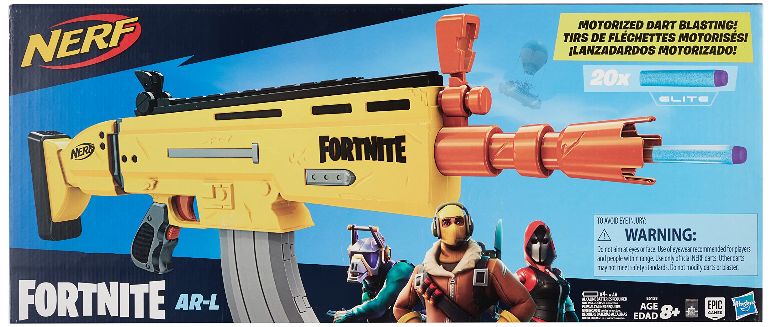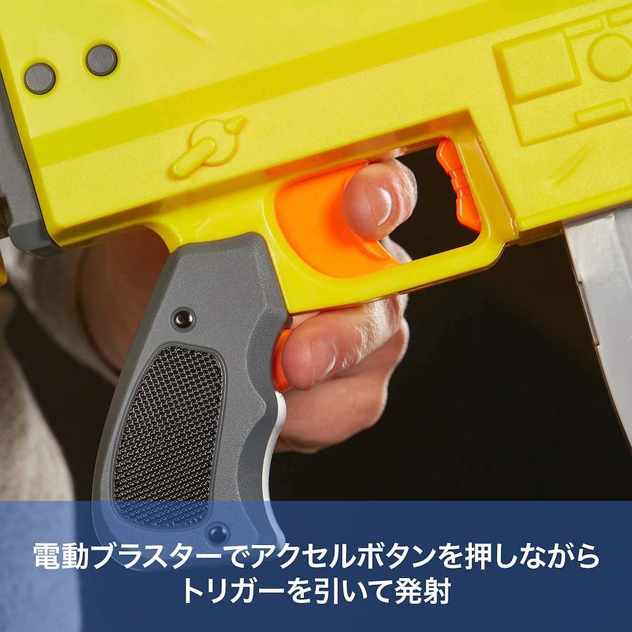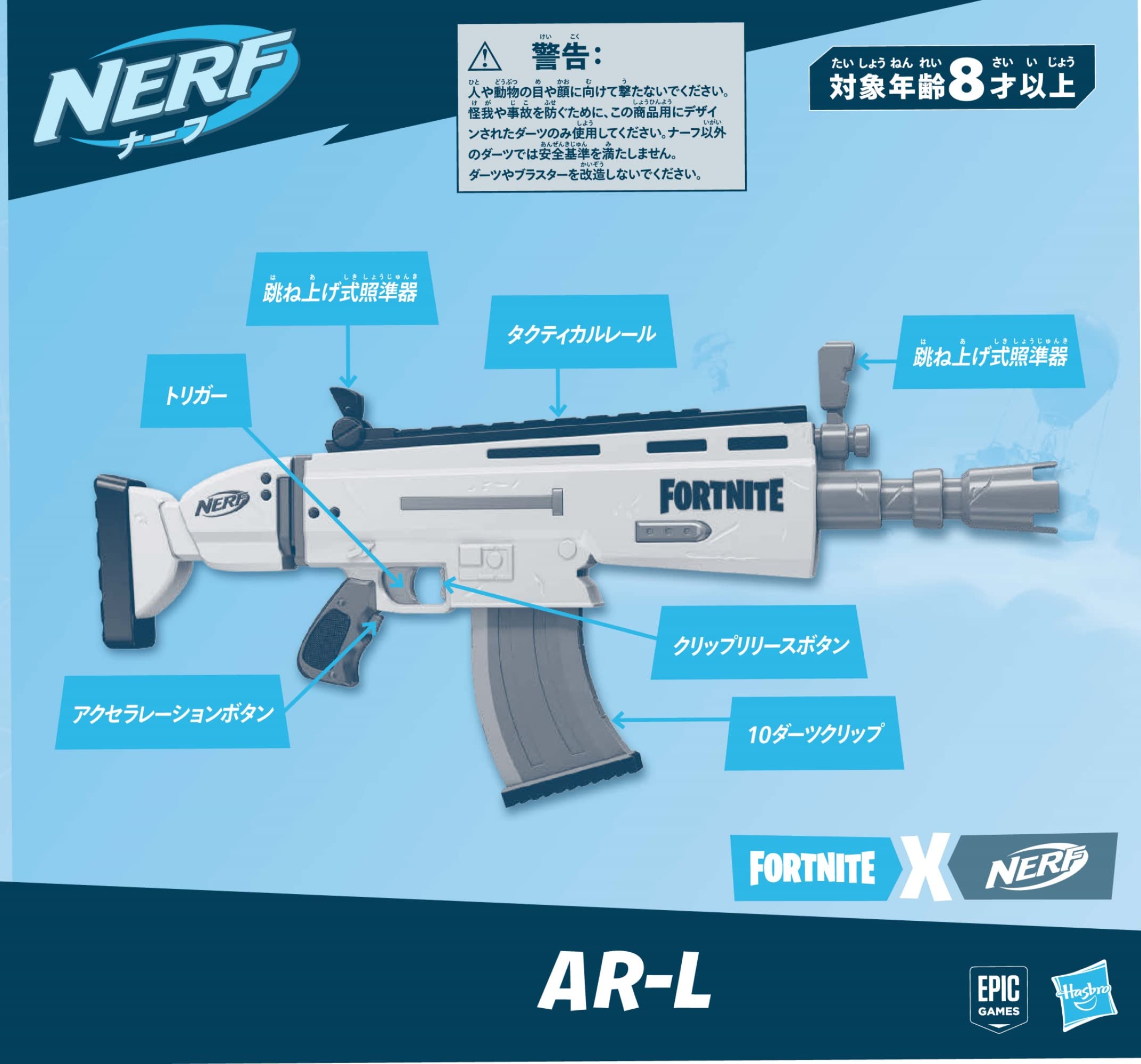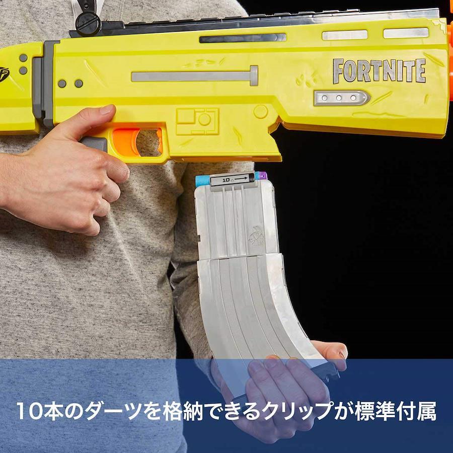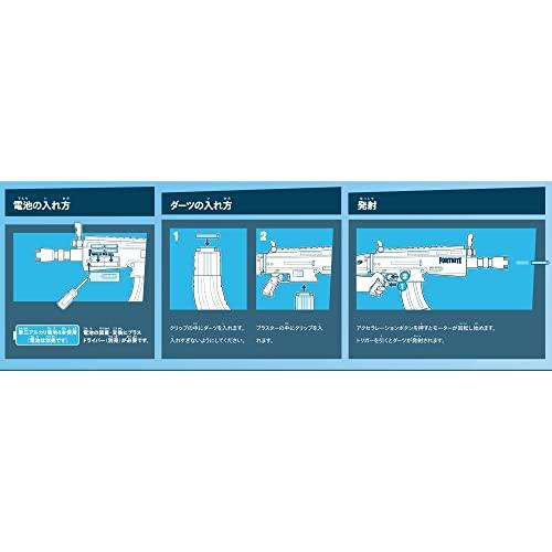 【フォートナイト中に登場する、ダーツを発射して遊べるレプリカ型ブラスター】人気のオンラインゲーム「フォートナイト」にインスパイアされて開発された、ナーフエリートシリーズのブラスター。カラーや見た目など、フォートナイトの世界観を実現。シューティングおもちゃ好きにはたまらない!【電動モデルで、ダーツを10発発射可能】本AR-Lブラスターは、アクセルボタン付きで、駆動力をパワーアップして発射することが可能です。(電池別売)【10本のダーツを格納できるクリップと、20本のダーツが標準付属】10本を格納するクリップ付き。パワーアップする際は、アクセルボタンを押しながら、トリガーを引いて、発射させてください。【跳ね上げ式の照準を標準搭載】跳ね上げ式の照準を2つ搭載しており、狙いを定めて発射することが可能です。[男の子のおもちゃとして人気]ダーツはスポンジ銃で出来ています。8才男の子のプレゼントにいかがでしょうか。【対象年齢:8才以上】セット内容:ブラスター本体、クリップ1つ、ダーツ20本、取扱説明書。単三型電池4 本で駆動(別売)【商品の使い方に関して、次の点をご確認ください】・新品のアルカリ電池を使用し、+-が正しく入っているか。・アクセスドア(ブラスター側面のドア)がきちんと閉まっているか。(何度か開けて閉めてみてください。ドアが少しでも開いているとモーターが作動しません。)・ダーツクリップがブラスターに差し込まれており、変形・破損などしていないダーツが装填されているか。・ダーツを入れすぎたり、ブラスターにダーツが詰まっていないか。【免責事項】メーカーによる商品リニューアルに伴いパッケージが変更が行われた場合、新パッケージでお届け致します事ご了承願います。