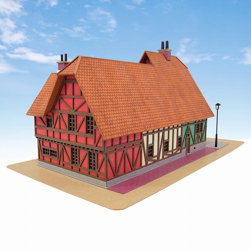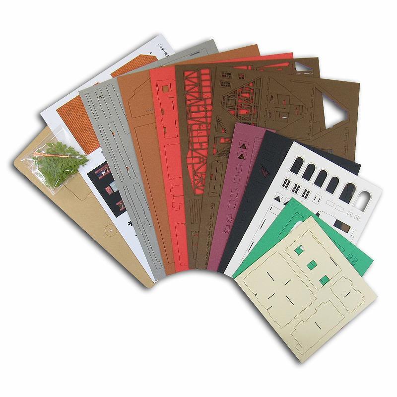 セット内容:レーザーシートA〜J(10枚)、樹木(針金、スポンジ)、屋根シート(1枚)、プラ板(1枚)、ベース(1枚)、組み立て説明書