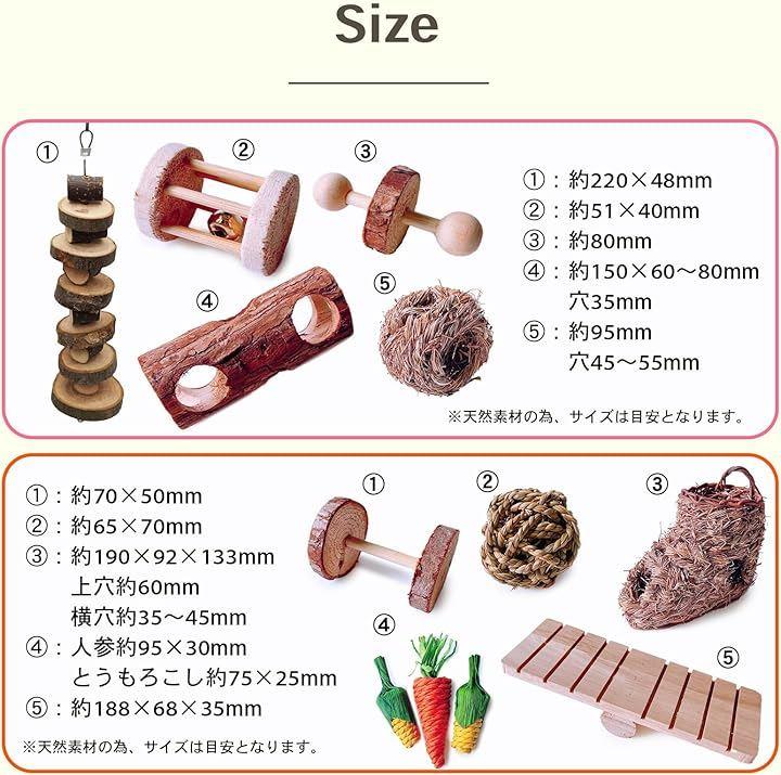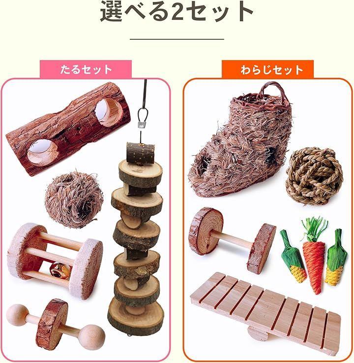 セット内容は、天然素材の巣箱、かじり木ローラー、木製遊び場、ラタンボール、にんじん型おもちゃ。