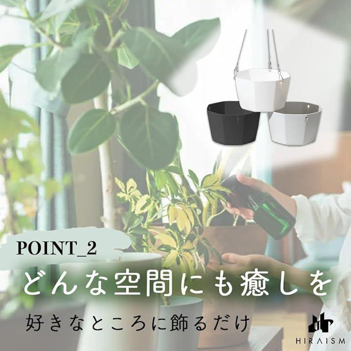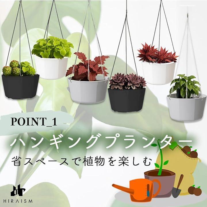 「商品内容」ハンギングプランター <サイズ>鉢本体 鉢上:約15cm 鉢底:約12cm 高さ:約9cm ワイヤー長さ:約36cm <重さ> 約126g <素材>鉢本体:ポリプロピレン ワイヤー:ステンレス <カラー>ホワイト/グレー/ブラック/3色セット(ホワイト+グレー+ブラック)