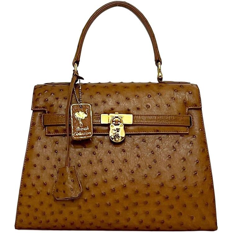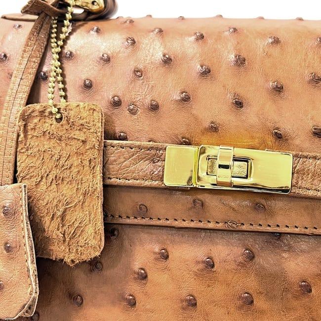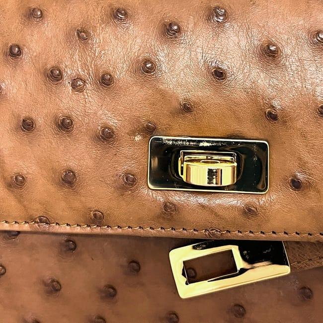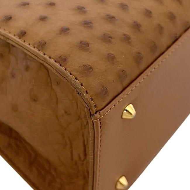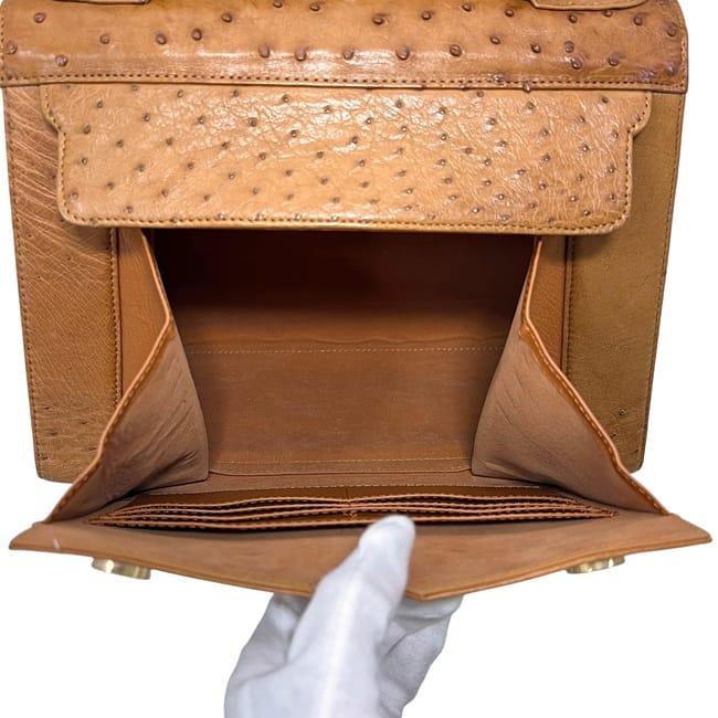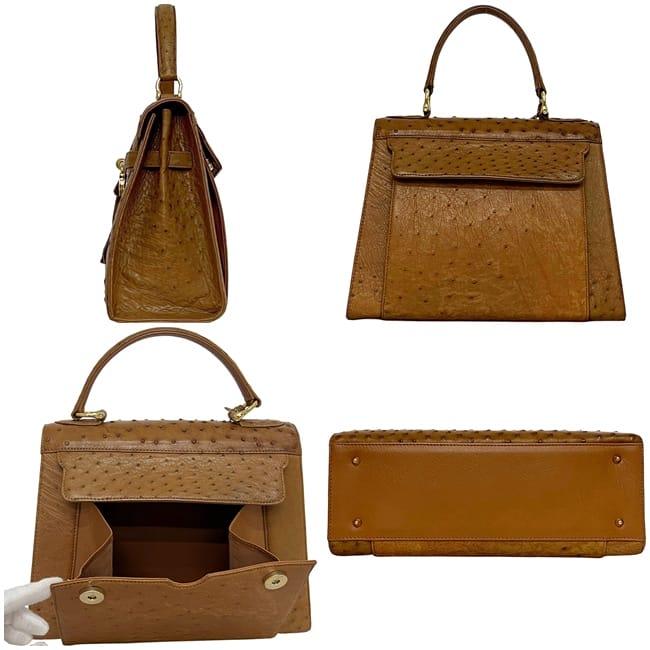 ハンドバッグ キャメル ブラウン 美品 オーストリッチ 本革 中古 フラップ リアルレザー ダチョウ 財布付 リアルレザー 定番 人気 鍵付 自立 ゴールド金具 エキゾチック アニマル シンプル レディース 女性 ヴィンテージ ブランド