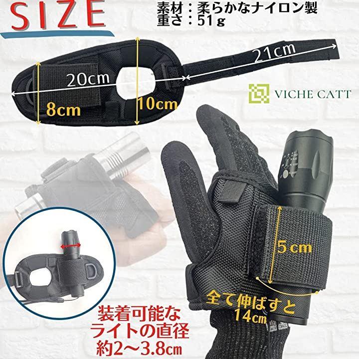 本体:長さ20cmx横幅 広い所10cm、狭い所(目安)7~8cm 親指通し穴:縦約5cmx横3,5cm 本体を手に固定するベルト:21cm ライトを固定するベルト:幅8cm、伸ばした長さ14cm 装着可能なライトの直径サイズ:約2cm~3,8cm 素材:ナイロン 柔らかい手触りです。
