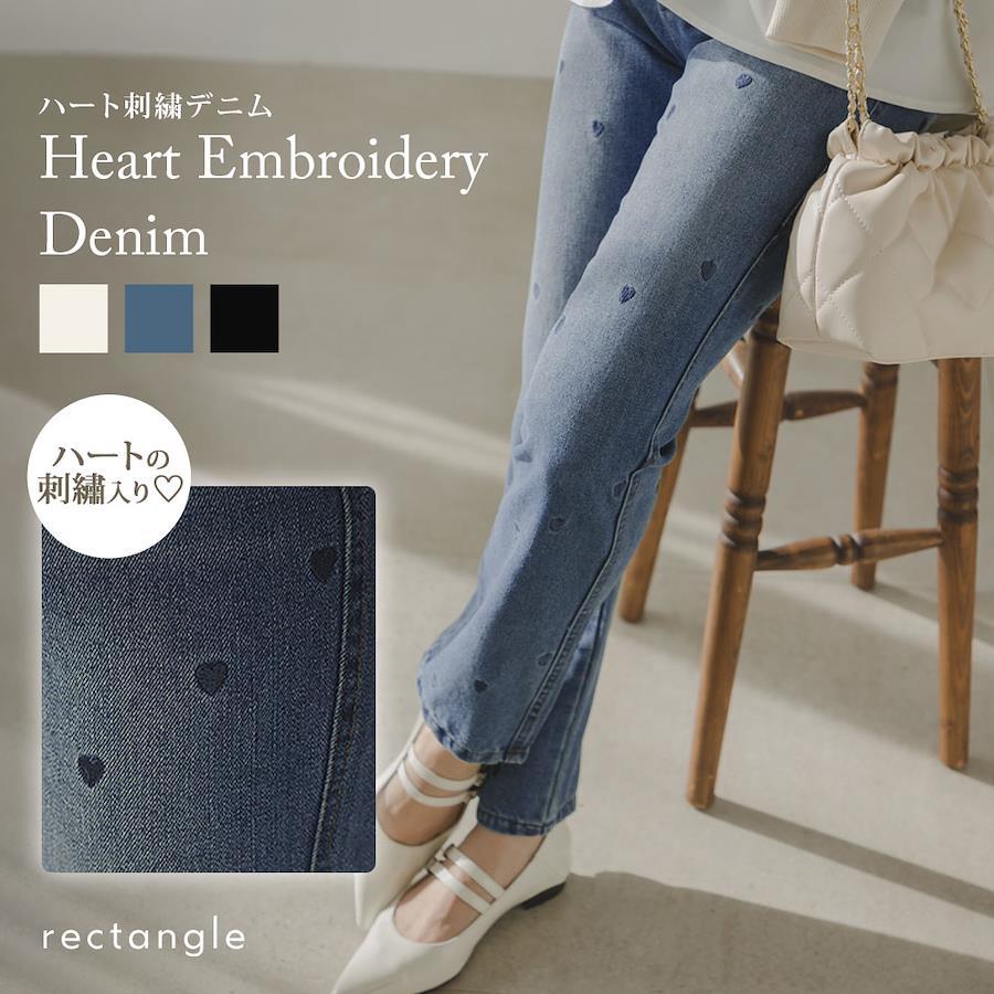 ハート柄刺繍がポイントドット見えが可愛いデニムパンツ【ディティール】一見ドット柄に見える刺繍はさりげないハートモチーフ。カジュアルなデニムに甘いポイントをプラスしました。ルーズ感がありながらも裾にかけてすっきりとしたテーパードシルエット。きれいめな印象に仕上がるので大人女子にぴったりです。バックウエストはゴム仕様になっており、リラクシーに履いて頂けます。【スタイリング】ストンと落ちるテーパードラインでヒール、フラットシューズ問わず合わせやいのも◎ジャストウエストで腰周りをすっきりと見せてくれ、トップスインやクロップド丈とのバランスの取りやすいのもポイント◎主張しすぎないドット柄がさりげないコーディネートのポイントになってくれます。**********************透け感:なし裏地:なし伸縮性:なし光沢感:なし生地の厚さ:普通**********************《生産国》中国