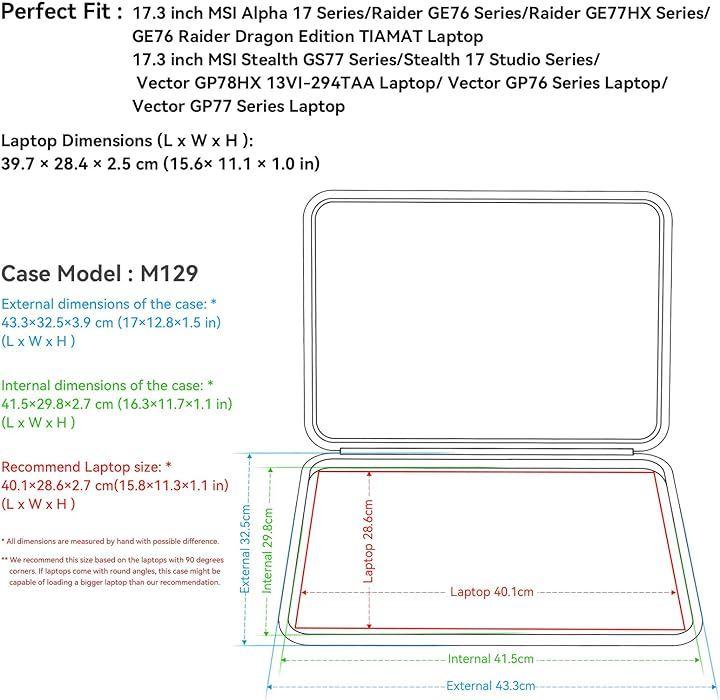 「モデル番号 : M129」ケースの外寸: 43.3x32.5x3.9cm(17.0x12.8x1.5インチ)、ケースの内寸: 41.5x29.8x2.7cm (16.3x11.7x1.1インチ)。