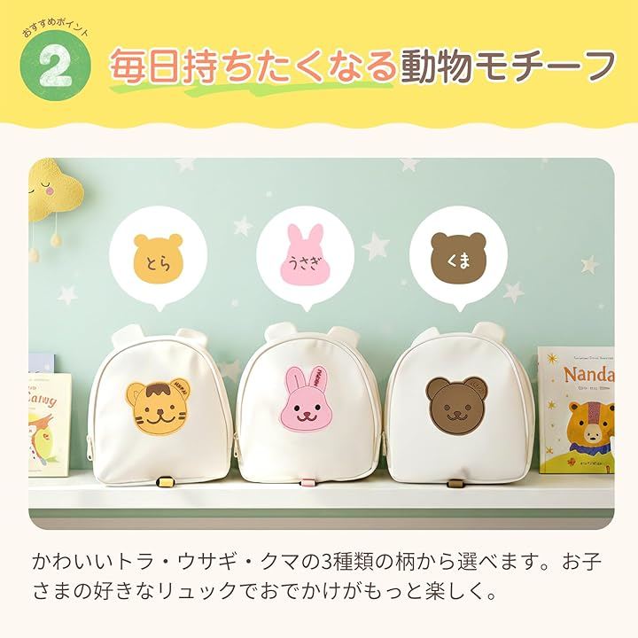 POINT2 毎日持ちたくなる動物モチーフ かわいいトラ・ウサギ・クマの3種類の柄から選べます。