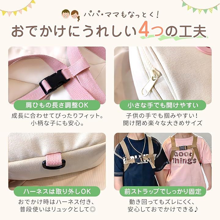 おでかけにうれしい工夫 ・肩ひもの長さ調整可能 ・小さな手でも開けやすい ・ハーネスは取り外しOK ・前ストラップでしっかり固定