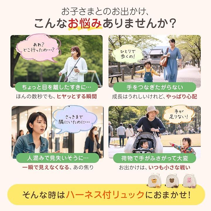 お子様とのおでかけでこんなお悩みありませんか? ・ちょっと目を離したすきに… ・手をつなぎたがらない ・人混みで見失いそうに ・荷物で手がふさがって大変 そんなときはハーネス付リュックにおまかせ。