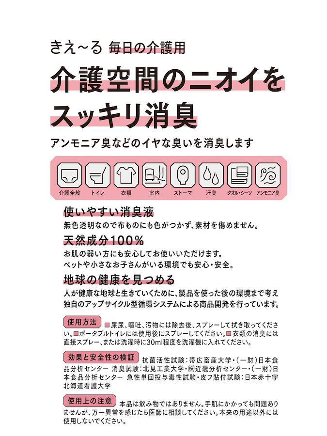 バイオで消臭 抗菌 肌に触れても安全 きえ?る介護用 バイオ消臭液 無香 500mlブランド 環境大善商品の形状 液体香り 無香素材の特徴 フレグランスフリー商品の個数 1ユニット数 1 個商品体積 17 液量オンス b 原産国 : /b 日本 b 内容量 : /b 500ml b 商品サイズ (幅X奥行X高さ) : /b 約65x65x高さ190mm商品紹介アンモニアから腐敗の臭いを元から消臭。乳酸菌や酵母菌などの有用微生物群を特殊な方法で発酵培養し、バイオエキス(酵素)を生産させたものです。有害菌は減らし有用菌の増殖を促進する抗菌活性力に優れております。この酵素がゆっくり蒸発、悪臭と有害菌に反応・分解消臭します。物本来の匂いや科学的に合成された匂いには反応せず有機物が酸化、腐敗して発生する悪臭にのみ反応する性質があります。バイオエキス(酵素)、乳酸菌、酵母菌原材料・成分バイオエキス(酵素)、乳酸菌、酵母菌