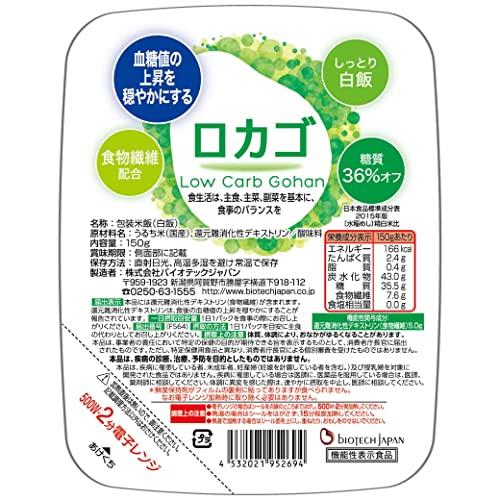 ごはんから食事を見直す「低糖質ごはんロカゴ」ロカゴは血糖値の上昇を抑える機能性表示食品ロカゴは白米100%なのに!糖質36%オフ、カロリー34%オフ!毎日食べるごはんで美味しく糖質コントロールが可能ロカゴを食べて、いつもの食事量で1日に摂取する糖質とカロリーを大幅にカットロカゴは、「糖質は摂りたくないけど、美味しくしっかり食べたい。」という声から生まれた糖質制限ごはんです。糖質制限の認識が広まる一方で、糖質を下げるために大麦、こんにゃくを入れた商品が多く、食感に違和感を持たれる方もいると思います。ロカゴは糖質制限をしたいけど、白飯を食べたいといった思いを実現した商品です。【通常の白米とロカゴの比較】 糖質36%オフ→3食分で角砂糖約14.8個分 カロリー34%オフ→3食分でウォーキング約80分相当 食物繊維17倍→3食分でレタス約7.1個分温めるだけの簡単調理で、常温の保存が可能なので備蓄食としても。【重要】メーカーによる商品リニューアルに伴いパッケージ(内容量も含む)変更が行われた場合、新パッケージでお届け致します事ご了承願います。