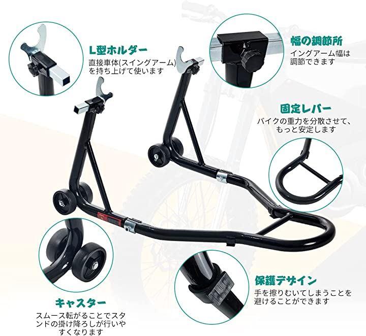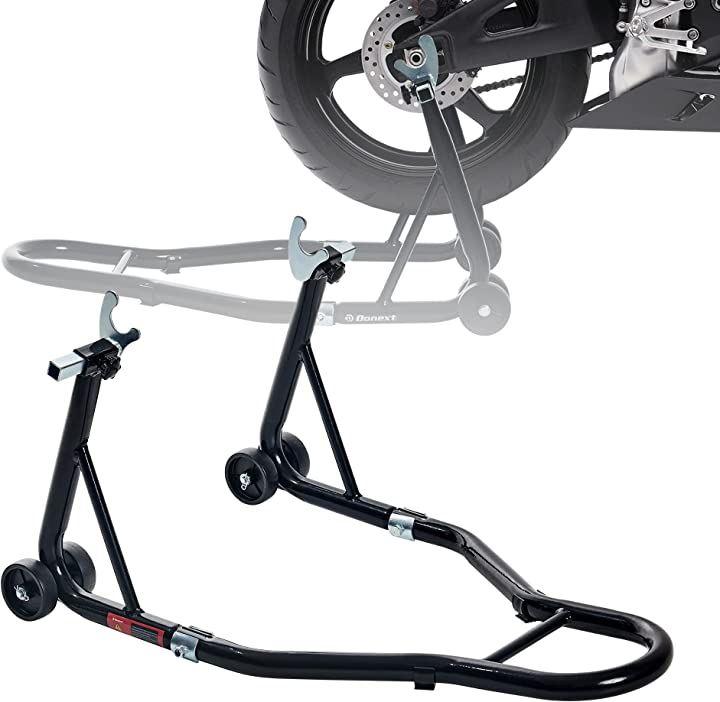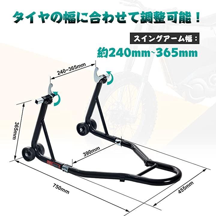 Donext バイクスタンド リア 耐荷重340kg U型 ブラック商品仕様*積載能力:750LBS(340kg)*スイングアーム幅:約240mm~365mm*保持高さ:約365mm*材質:スチール、亜鉛メッキ*重量:4.64kg楽にメンテナンス作業しましょう~~Donextのバイクスタンドは耐荷重340kgまでのメンテナンススタンドです。